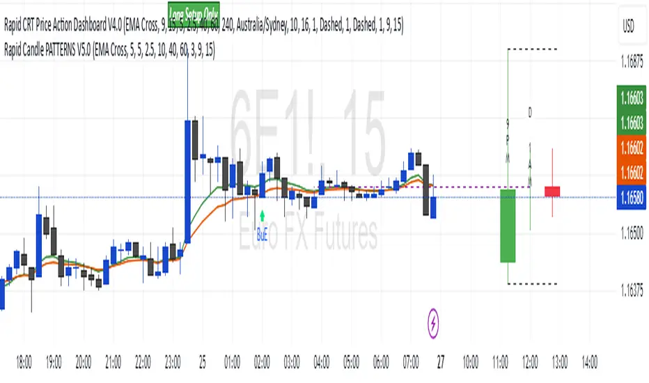 - [] The Trend Filter Engine (New!): The flagship feature of V4.0. You can now automatically filter all pattern signals based on the trend, defined by two integrated EMAs on the higher timeframe. This is designed to eliminate weak, counter-trend signals and keep you trading with the market's flow. [] 'Effortless Reversal' Volume Logic (New!): We've completely reversed the conventional wisdom on volume. The engulfing pattern logic now looks for a reversal on LOWER volume, identifying true trend exhaustion and a more reliable change in direction. [] Complete V4.0 Pattern Engine: We've moved far beyond the simple logic of V2.0. Every pattern is now a "setup" with its own set of advanced, contextual filters (more details below). [] The CRT Dashboard Visuals: The dashboard now features the "CRT Market Profiles" layout, with intelligent projection lines and vertical time labels inside the mini-candles. [] Full Customization: V4.0 adds a huge number of new settings, allowing you to fine-tune every aspect of the new pattern logic, line styles, and timezones to create your own unique edge. [] Integrated EMAs: Two configurable EMAs have been added, providing an instant view of the underlying trend and powering the new Trend Filter.