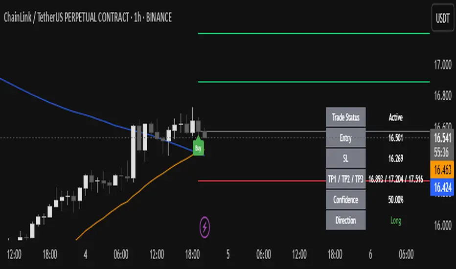 -Visual Markup: Draws entry, SL, and TP lines on the chart, and includes a floating info panel with trade status, targets, SL, confidence, and direction.
