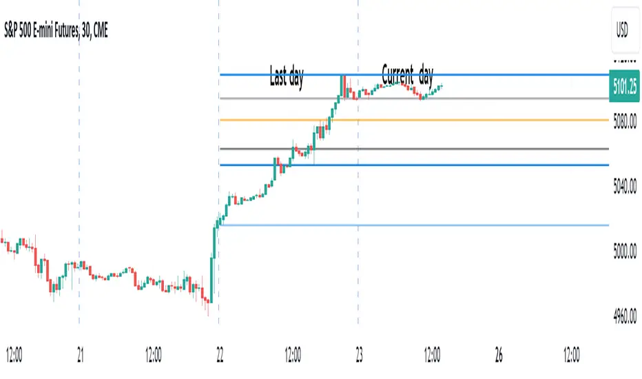 Indicator draws several most important intraday levels: last day RTH high/low, ETH high/low, Half Back, Day Close and current day RTH Day Open. These levels often act as support/resistance for intraday price movements. Also, they can help to assess day character and control of power.