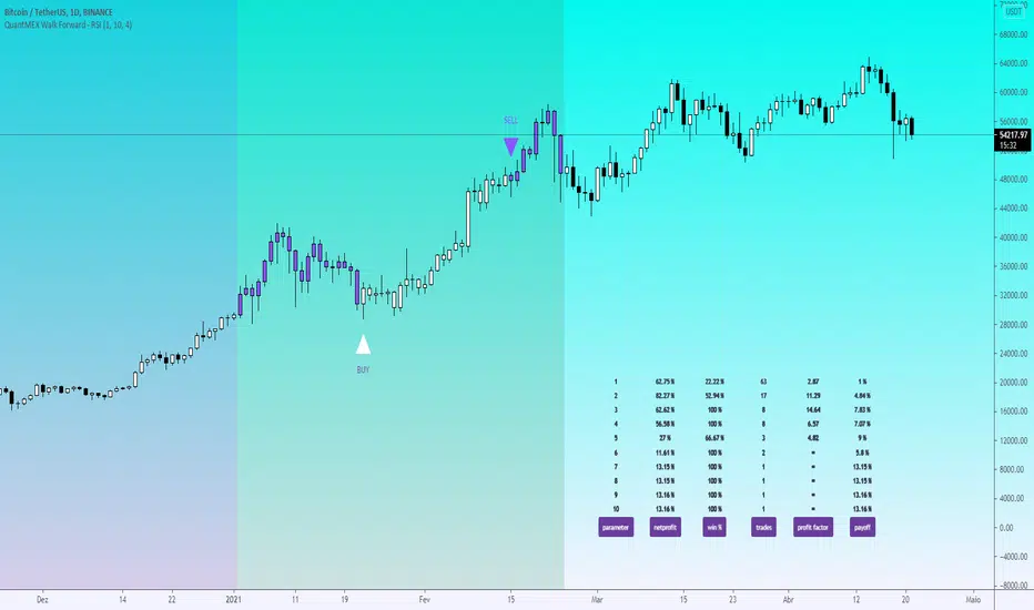Simulation is one of the most powerful analytical techniques ever created. It is a crucial step in finding effective strategies. The purpose of this indicador is the walf-forward simulation method for the classic Relative Strength Index, adopting a systematic and orderly procedure designed to realistically test a hypothesis based on its functionalities without the need to use the Tradingview backtest. The indicator allows to check the net profit, percentage of winning traders, total trades, profit factor and payoff of several parameters simultaneously.