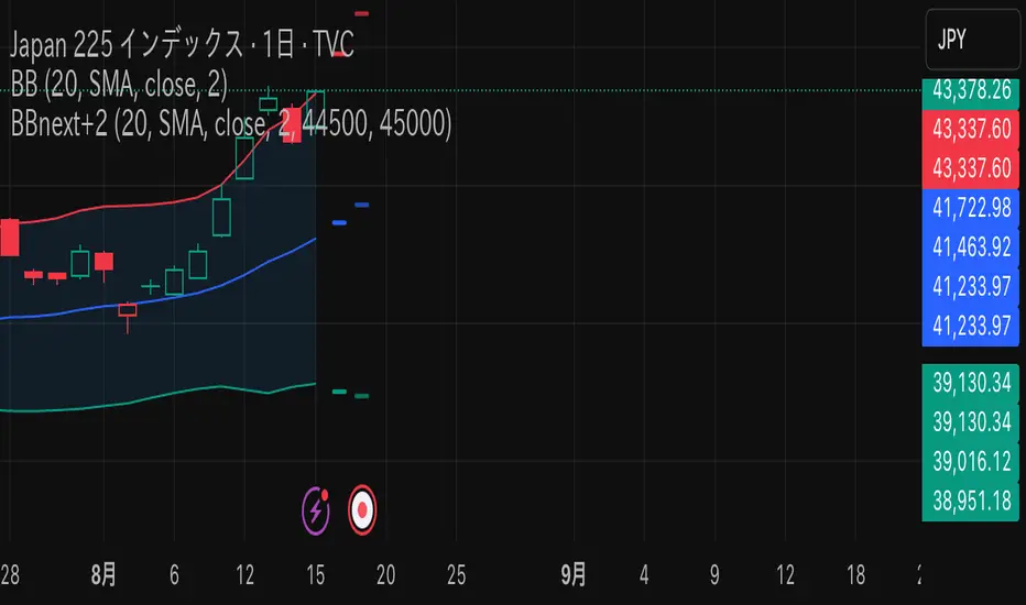 This indicator extends the standard Bollinger Bands by allowing you to project future Bollinger Bands based on assumed closing prices for the next trading day (+1) and the day after (+2).