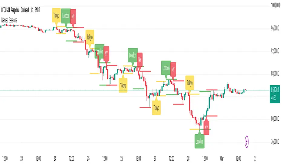 - Session label is placed above or below depending on price move during session, visually indicating the trend (also works during open session)
