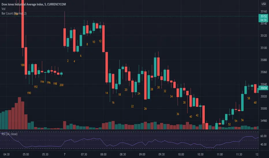 Bar Count Indicator for TradingView. It will label bars with numbers underneath which is awesome when sharing analysis or waiting for bars 7 (50% chance), 12 (70% chance), and 18 (90% chance) looking for higher probability for the High or Low of the day to have formed.