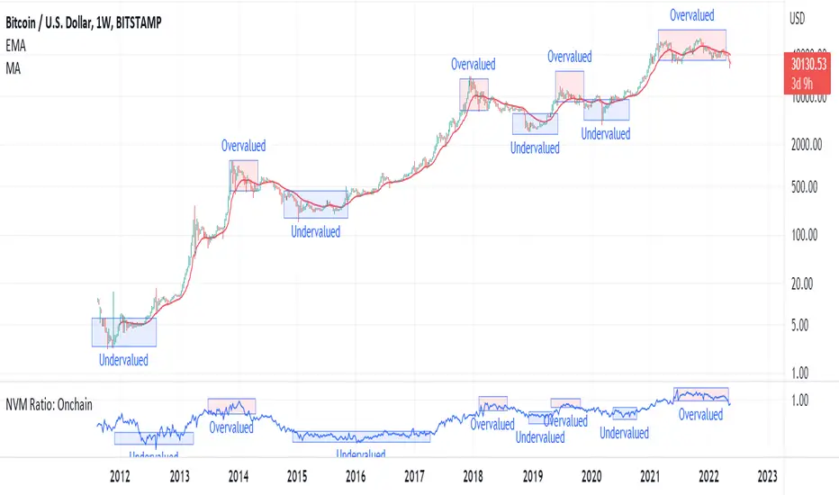 This oscillator evaluates bitcoin price according to the Metcalfe Ratio to show whether the current value of Bitcoin is higher or lower than the real price