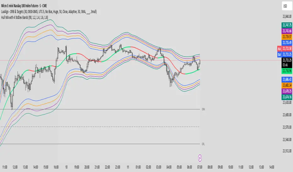 This indicator plots a Hull Moving Average (HMA) of (High + Low) / 2 with a default length of 90, surrounded by four customizable standard deviation bands.