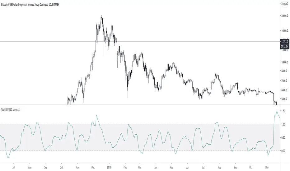 As the bottom reading of BBW changes dynamically with bull market progression, a relative bottom is preferred than absolute, hence normalization of BB Width via bollinger bands and %b, i.e. distance of datapoints from stdev band.