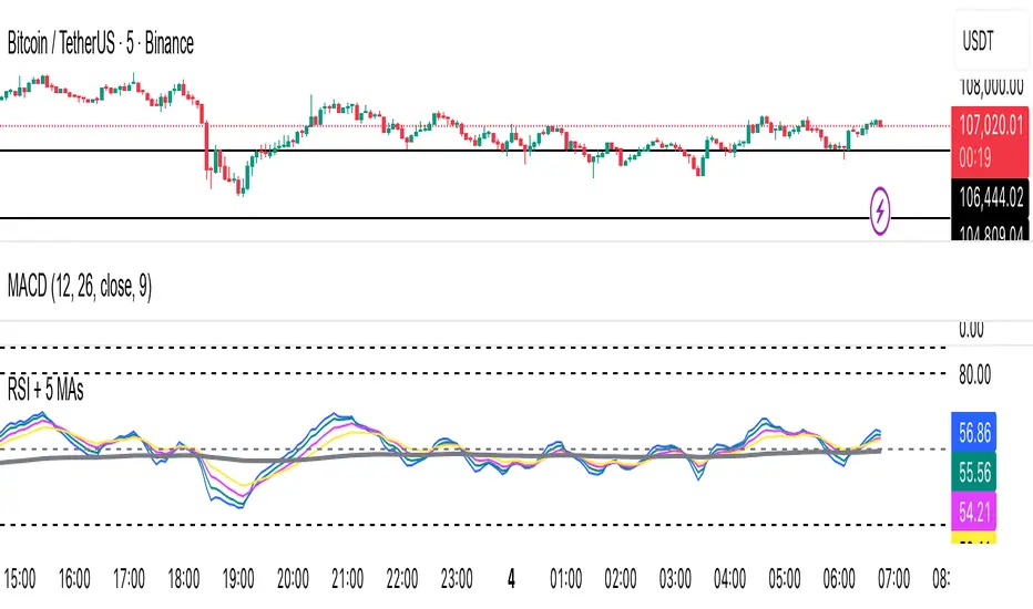 This indicator combines the Relative Strength Index (RSI) with five customizable moving averages and five horizontal levels to help identify momentum, overbought/oversold zones, and trend strength.