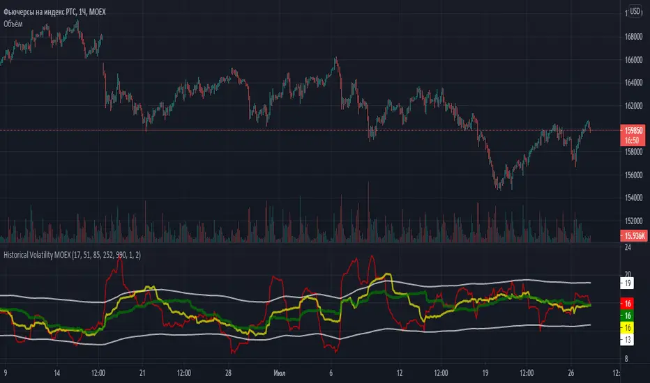 Индикатор оптимизирован под часовые бары и отображает - красная линия - 1 дневная, желтая линия - 3 дневная, зеленая линия - 5 дневная историческая волатильность.