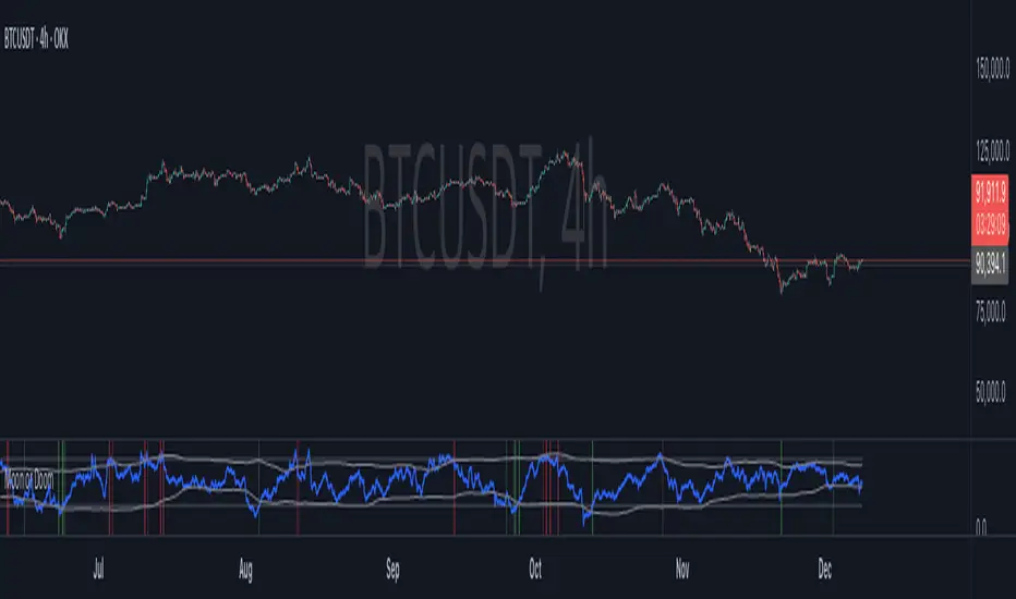 Moon or Doom indicator identifies crypto market sentiment using six normalized components: RSI, ATR volatility, price deviation, BTC dominance, open interest, and funding-rate behavior.