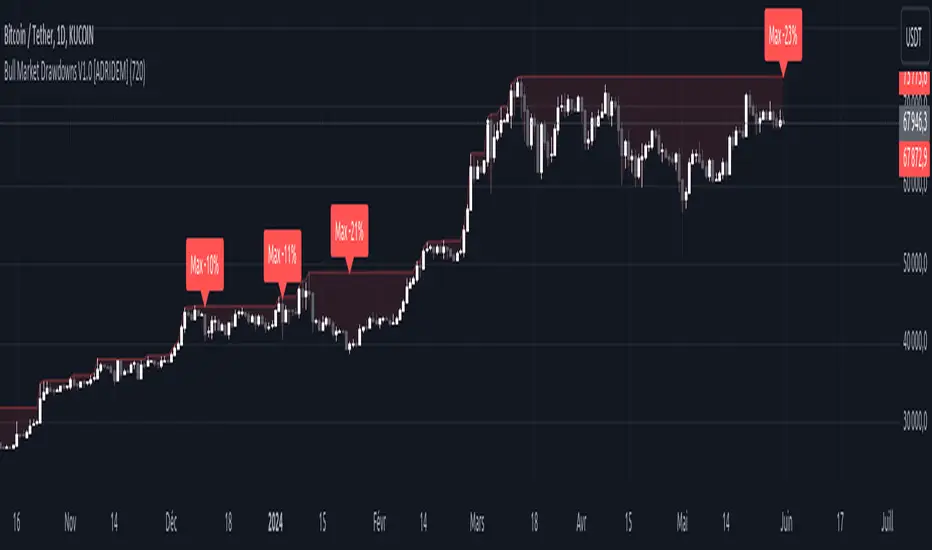 This script provides a detailed view of drawdowns during a bull market, helping traders make more informed decisions by understanding the extent and impact of market retracements. By combining customizable settings with visual markers and drawdown analysis, traders can better align their strategies with the underlying market conditions, thus improving their risk management and decision-making processes.