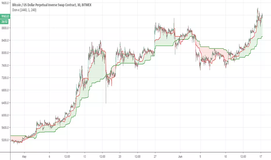 Simple indicator that nased on two donochian bases each calculated slight different with MTF , where we based a faster of 240 min over slower of daily one on each other and we put on lower time frame (30 min, 1 hour or 2 hour )