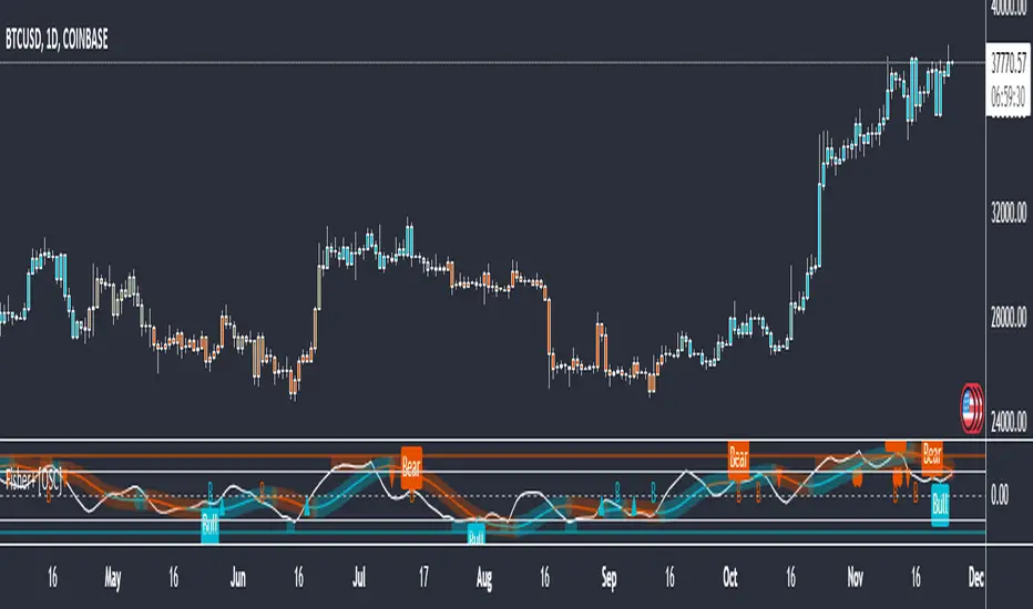 The moving average line will turn red/blue as long as the fisher line is below/above the moving average. The shaded MA line will switch colors based on if it is moving in an up/down trend. The MA can also be used as a signal and treated similar to an oscillator. Market trending conditions will either keep the MA below/above the dashed zero line.