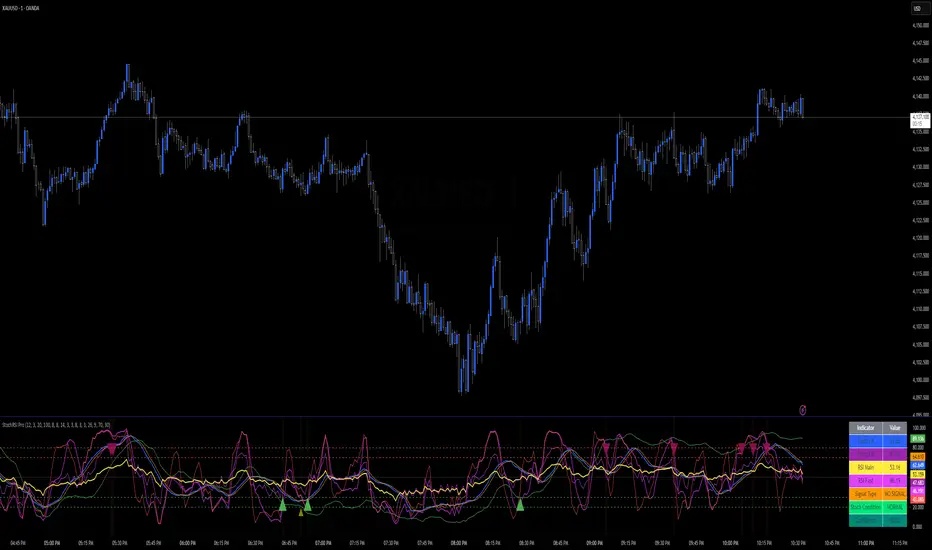 This indicator enhances the classic Stochastic RSI concept by implementing a multi-timeframe and multi-parameter approach to generate more reliable trading signals. Unlike simple indicator mashups, this tool is designed with layered confirmation logic that integrates four different Stochastic timeframes with dual RSI periods.
