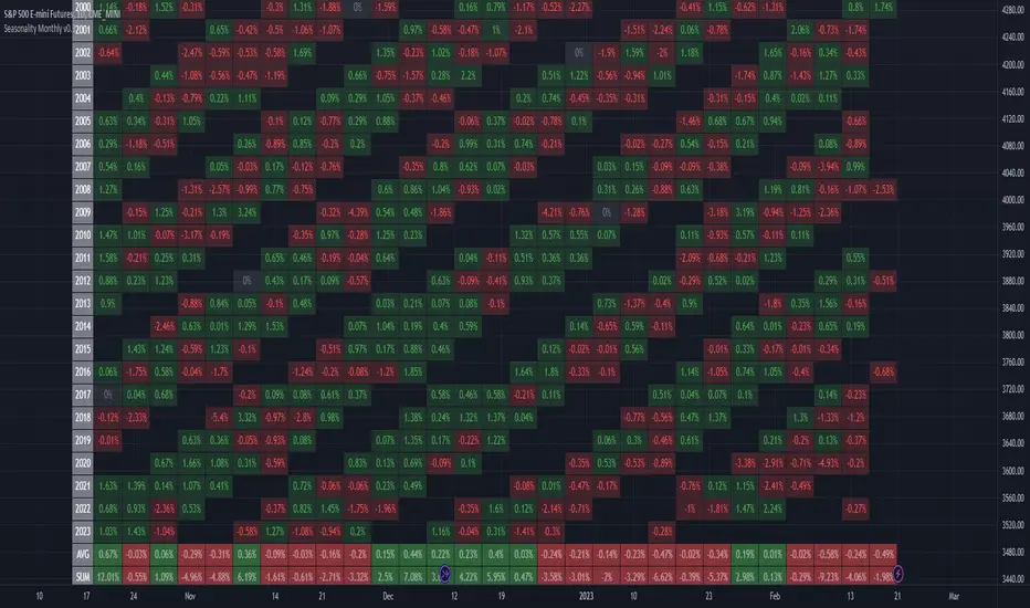 This indicator displays the seasonality data for any instrument (index/stock/ futures /currency) in a tabular data by day of the month (Day 1..31).