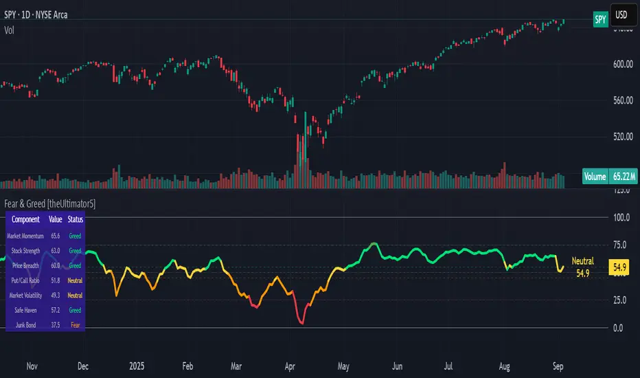 This indicator attempts to replicate CNN's Fear & Greed Index methodology to measure market sentiment on a scale from 0-100. It combines seven key market components into a single sentiment score, where lower values indicate fear and higher values indicate greed.