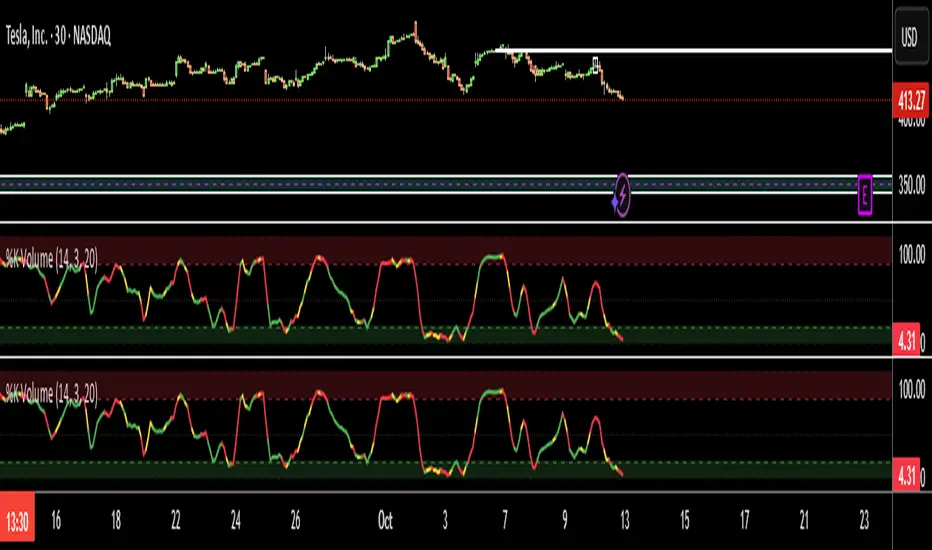 "Stochastic %K Colored by Volume is a technical indicator that combines the traditional Stochastic %K oscillator with volume-based coloring. It highlights periods of high, low, and neutral trading volume by changing the color of the %K line. Additionally, it identifies bullish and bearish divergences between price and the %K oscillator, helping traders spot potential reversals and trend changes. The indicator also includes key levels for overbought, oversold, and extreme zones to guide trading decisions."