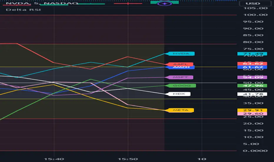 The default is to compare MSFT, NVDA, TSLA, GOOG, META, AMZN, AAPL and NASDAQ. You could do the same for currency pairs and any other instruments available in Trading View. However, it makes the most sense to compare seven instruments to an eighth underlying instrument. As you can see in the default values, we included the NASDAQ as the eighth instrument since the other seven are part of the NASDAQ composite index. If you were to trade major currency pairs, then your eighth instrument would most likely be the U.S. Dollar (DXY).