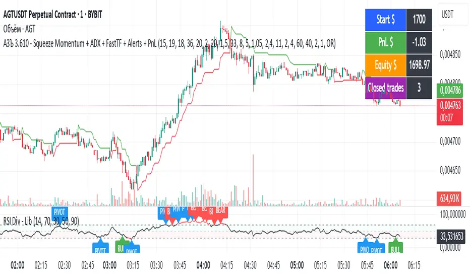 Güncellendi АЗЪ 3.610 - Squeeze Momentum + ADX + FastTF + Alerts + PnL