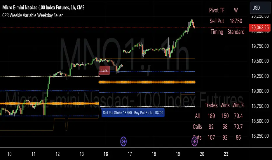 This is a script I built for option selling, in attempt to have a high success rate. This is pretty much the same as my other one titled "CPR Option Selling Strategy." The difference is this one is strictly for Weeklies, with a variable weekday to expiry. I've had many requests to have a weekly that would end on Thursday, so here it is. Just select the date for expiry of the option, then it will calculate a "weekly" option set, using the the same set up as the traditional M-F weekly CPR information, except for offset for the weekday in question.