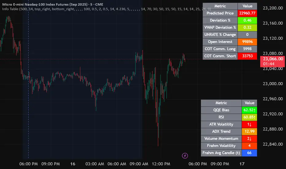The Info Table V1 is a versatile TradingView indicator tailored for intraday futures traders, particularly those focusing on MESM2 (Micro E-mini S&P 500 futures) on 1-minute charts. It presents essential market insights through two customizable tables: the Main Table for predictive and macro metrics, and the New Metrics Table for momentum and volatility indicators. Designed for high-activity sessions like 9:30 AM–11:00 AM CDT, this tool helps traders assess price alignment, sentiment, and risk in real-time. Metrics update dynamically (except weekly COT data), with optional alerts for key conditions like volatility spikes or momentum shifts.