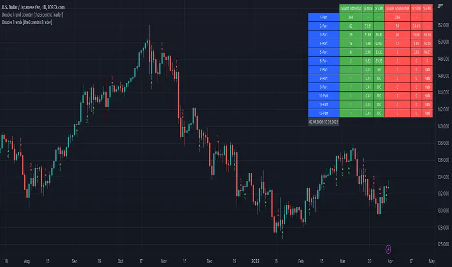 This indicator counts the number of confirmed double trend scenarios on any given candlestick chart and displays the statistics in a table, which can be repositioned and resized at the user's discretion.