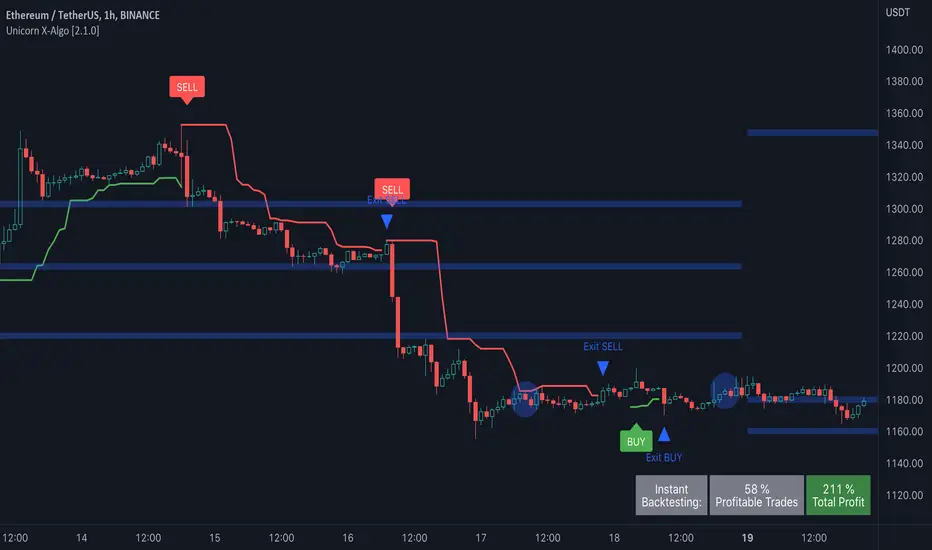 Its core is a trend trading strategy based on our enhanced Trailing Stop-Loss algorithm. This strategy provides the user with position entry and exit signals. It is customizable and has a built-in instant backtesting feature.
