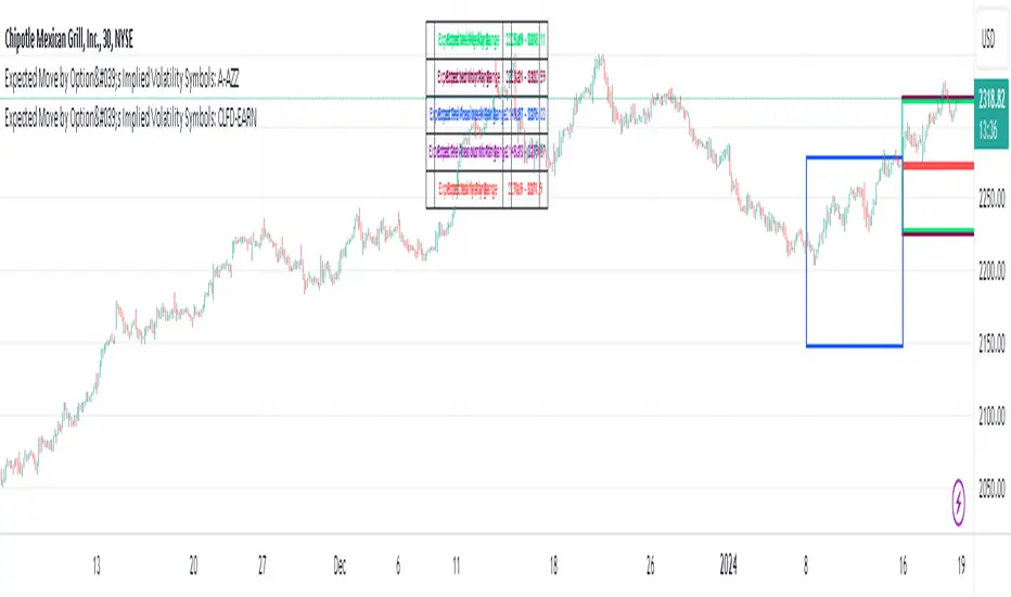 This script plots boxes to reflect weekly, monthly and yearly expected moves based on "At The Money" put and call option's implied volatility.Symbols in range: This script will display Expected Move data for Symbols within the range of CLFD - EARN in alphabetical order. Visit imliedvolatilty.net to get full expected move reports based on implied volatility of over 4000 symbols.