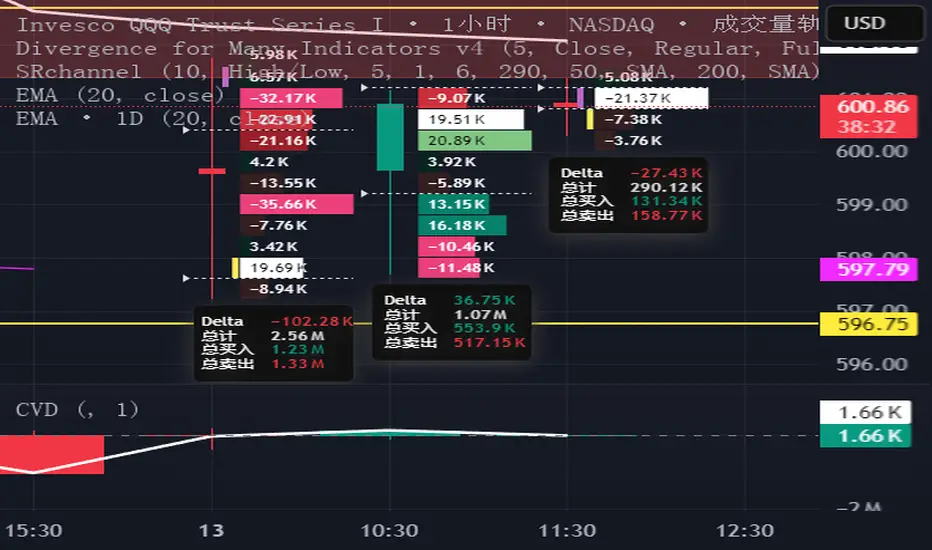 This indicator augments the traditional Cumulative Volume Delta (CVD) by incorporating a customizable trend line that connects the tops of the CVD histogram bars, enhancing visualization of delta trends and market momentum. The CVD measures the net difference between buying and selling volume, utilizing lower timeframe data for accuracy, with configurable anchor periods and timeframe options. The trend line, which can be tailored in both color and style (e.g., solid, dashed), provides traders with a flexible tool to track cumulative delta movements, aiding in the identification of market sentiment shifts. Perfect for volume-based analysis with a clear, adaptable display.