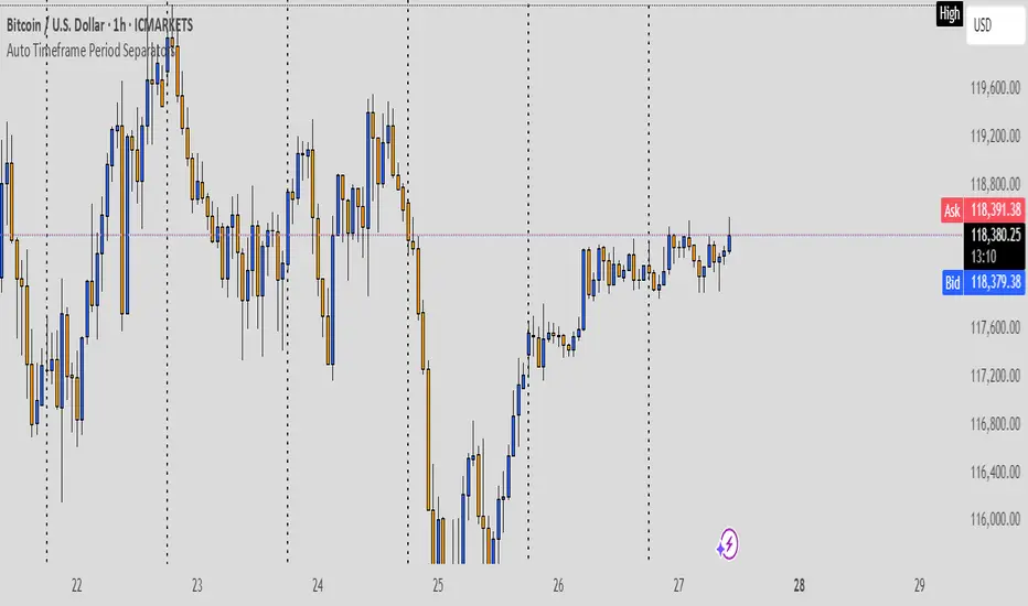 This indicator automatically draws clean vertical separators to mark the boundaries of higher timeframes, adapting dynamically to your current chart resolution. Perfect for traders who analyze multiple timeframes without switching charts!