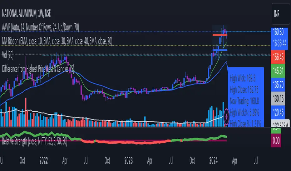 It calculates the difference between the highest high/highest close of the last N candles and the current trading price, along with their percentage differences.
