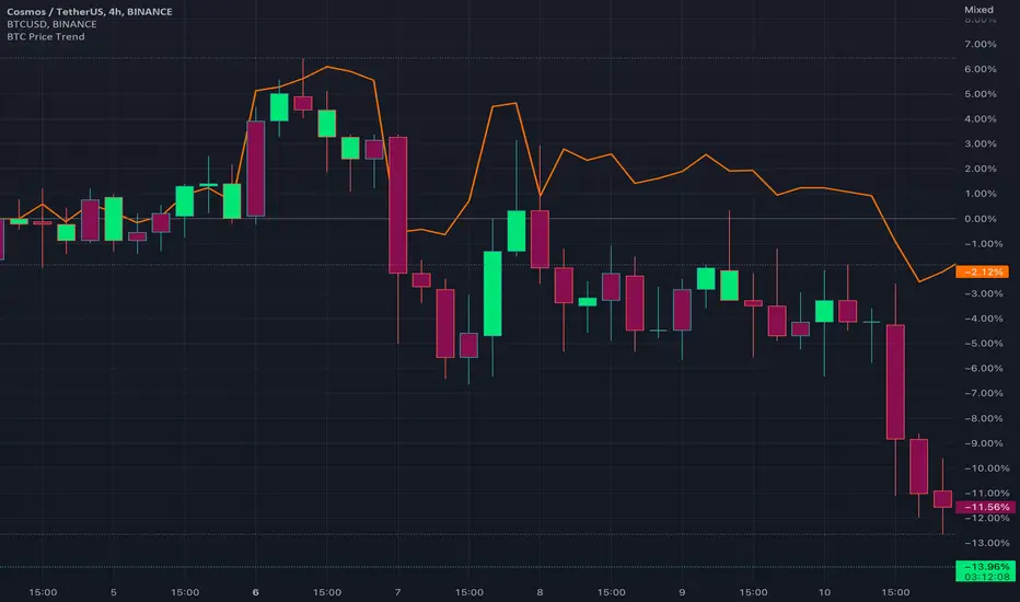 This script will color the candles based on the BTC price trend. Set the timeframe and down/up percentage to monitor the BTC price trend, and the script should not repaint.