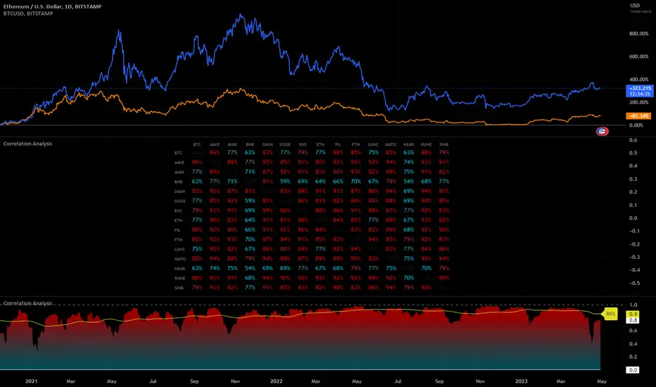 - The Curve: represents the historic correlation coefficient between the current chart and the “Reference Market” input from the settings menu. It aims to give more depth to the current correlation values found in the second feature.