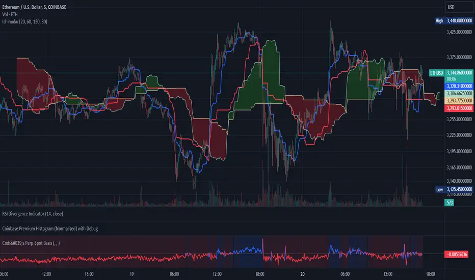 This indicator calculates the percentage basis between perpetual futures and spot prices for crypto assets. It is inspired by the original concept from **Krugermacro**, with the added improvement of **automatic detection of the asset pairs** based on the current chart symbol. This enhancement makes it faster and easier to apply across different assets without manual configuration.