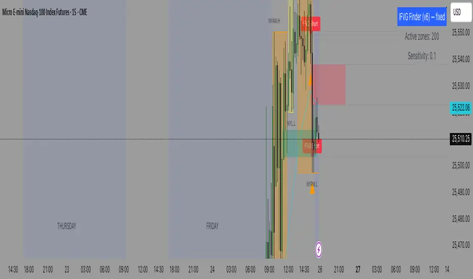 Marks Inverted Fair Value Gaps (IFVGs) when price breaches (invalidates) an FVG and later retests it from the other side.