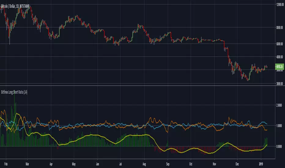 This is a simple indicator that creates a ratio of margin Long & Short positions on Bitfinex for the ticker you currently have selected. If the ticker you are looking at does not have margin positions on Bitfinex; it will error out - however when you select another ticker it automatically resets.