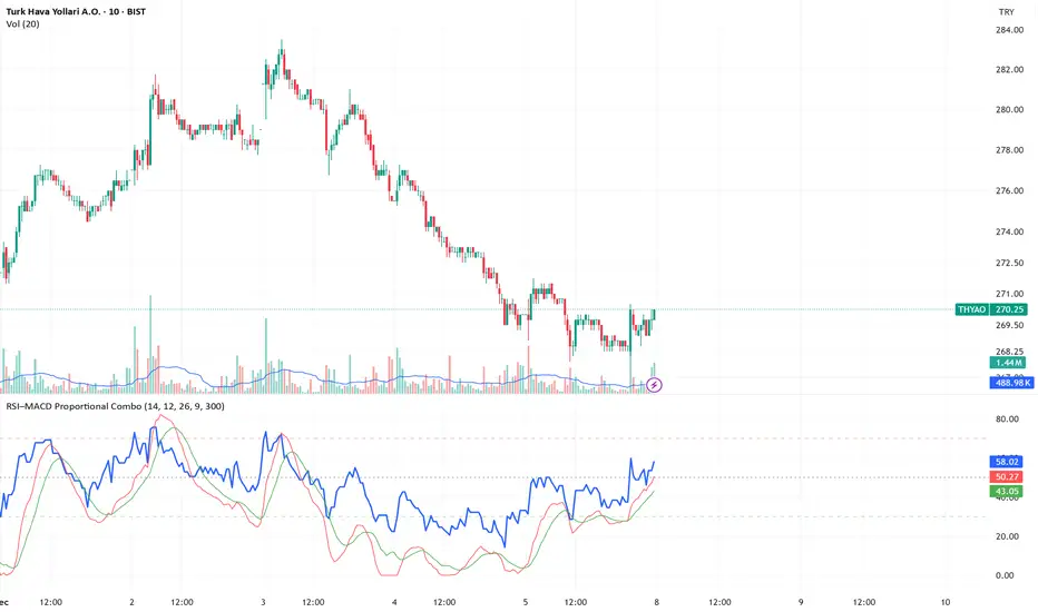 MACD values are normalized so they can be displayed together with RSI on the same 0–100 scale. This allows both signals to be compared directly and interpreted more intuitively.