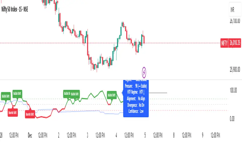A multi-line dashboard summarizes current pressure, regime classification, higher timeframe regime, pressure direction, divergence status, and alignment conditions. The dashboard is informational only. No part of the dashboard should be interpreted as a trade instruction.