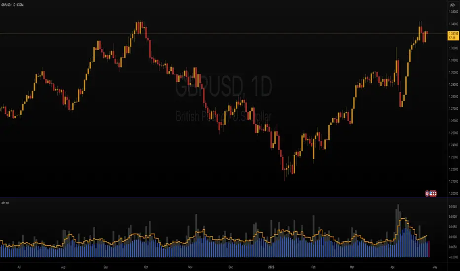 - The projected range: a thinner blue histogram column, this is offset one bar forward, as it is a future estimate/forward-looking. It too will repaint if the current day is still not complete.