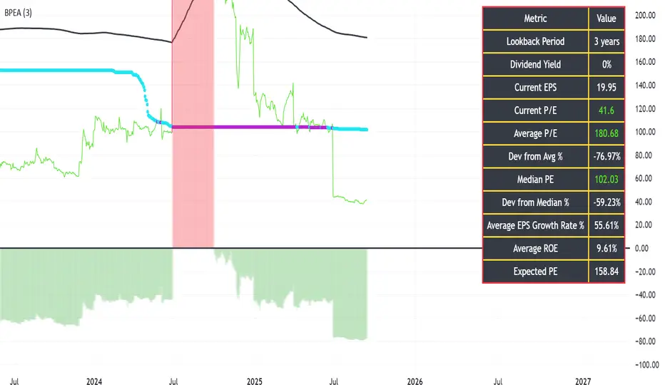 4) Another plots exists for plotting the current PE which is red or green depending upon its deviation from the average PE values & another plot exists for median PE ratio which is light blue when healthy and purple when not healthy.