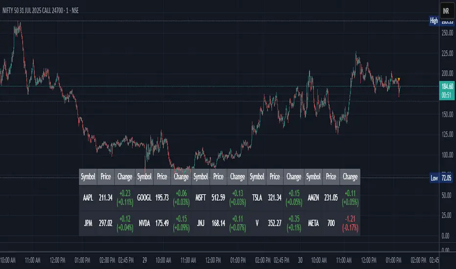 The display structure is dynamically generated using table.new() and related functions. Internally, the script stores symbol and price data in arrays for efficient processing. Symbols are cleaned to remove exchange prefixes (e.g., "NASDAQ:", "BINANCE:") so only the ticker name is displayed. Based on the selected layout (1 to 5 columns), the table auto-adjusts its row structure to maintain clarity and symmetry. Each cell reflects the ticker symbol, current price, and changes, with conditional formatting applied to indicate price movement direction using green (positive), red (negative), or neutral colors.