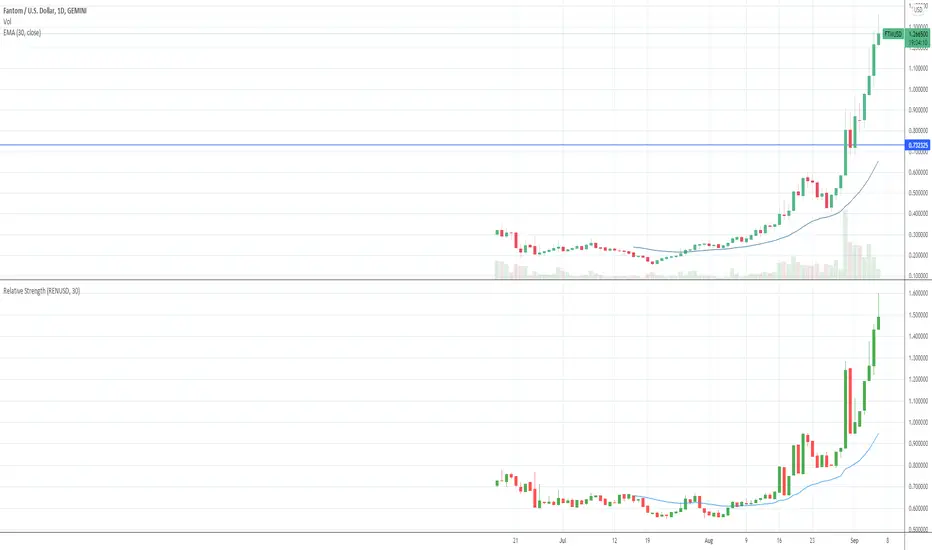 Indicator meant for crypto markets. Computes the relative strength of the current ticker against a target ticker and plots a candlestick chart. Also, plots an exponential moving average of the relative strength.