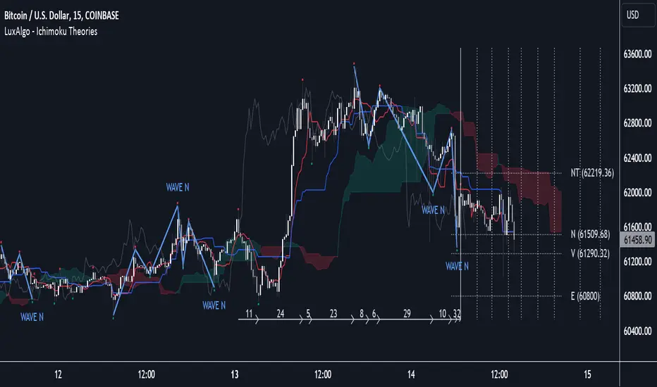 - Time Cycle Mode: Choose from 7 time cycle detection modes: Tenkan Sen cross, Kijun Sen cross, Kumo change between bullish & bearish, swing highs only, swing lows only, both swing highs & lows and wave detection.
