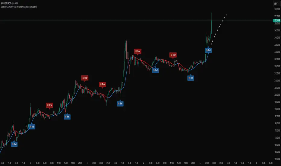 🔹Machine Learning Price Predictor: Ridge AR is a research-oriented indicator demonstrating the use of Regularized AutoRegression (Ridge AR) for short-term price forecasting.