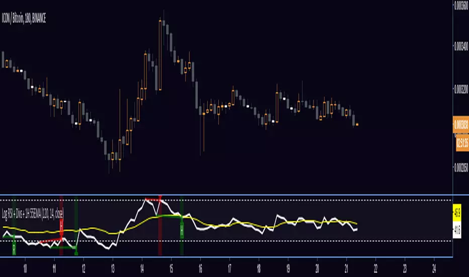 RSI calculated for log scale, with divergences labeled, as well as a 1 hour 55 EMA for signal.