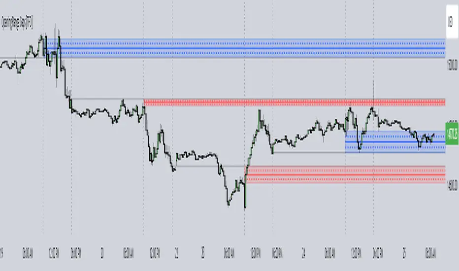 This indicator displays Opening Range Gaps with an adjustable time window. Its intention is to capture the discrepancy between the close price of previous and new Real Trading Hours (RTH) sessions, i.e. yesterday's close compared to today's open. A gap will be drawn from this area with a solid line denoting its midpoint, and dashed lines denoting the upper and lower quartiles of its range. Its color is determined by whether the new session open price is above or below the previous session close.