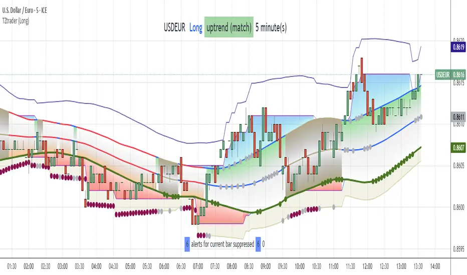 This is a TrendZones version with features to set stoploss and targets in short and long positions meant for use in intraday charts. It aims to provide signals for opening and closing long and short positions. In the comments under the TrendZones publication several people expressed a need for features for a short position similar to those for a long position as implemented in TrendZones, some want to use it for scalping, some asked for alerts. When I proposed to create a version for day trading with target lines based on ATR, several people liked the idea.