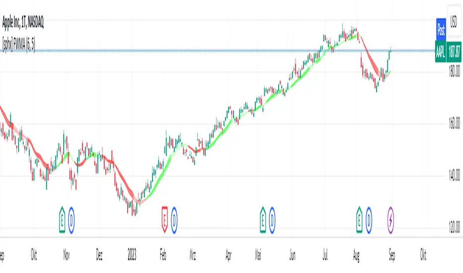 I've developed a cool indicator. The indicator calculates a Fibonacci-weighted moving average (FWMA) based on a specific length. What sets it apart is that it assists me in identifying potential trend reversals. When the indicator's color changes - from red to light red or from green to light green - it's an indication that the trend might be shifting.