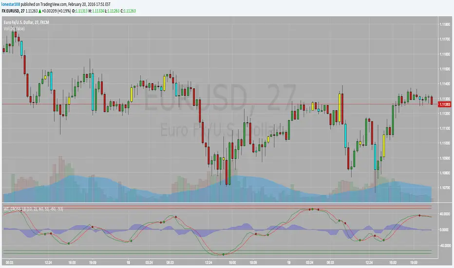 LazyBear's wavetrend oscillator enhanced with wavetrend cross visualization on the indicator as well as with bar color highlights.
