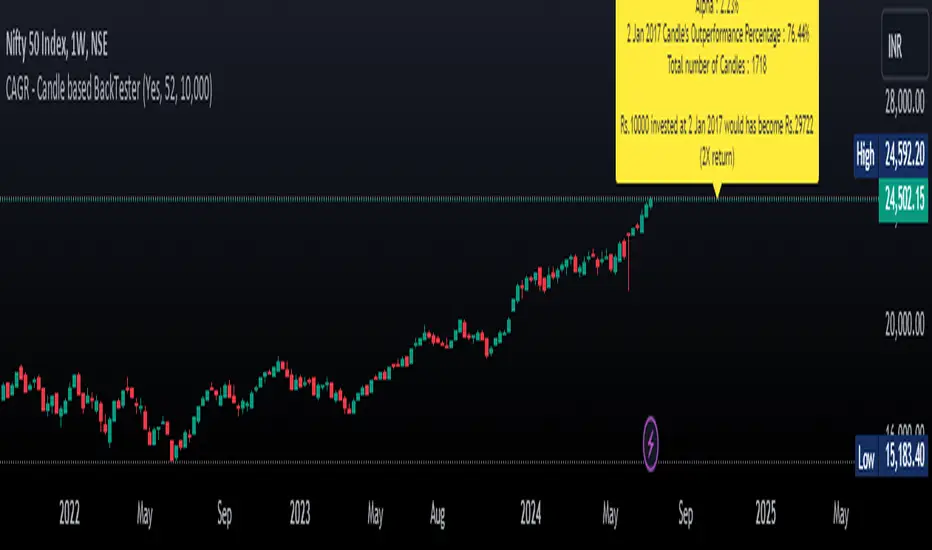 CAGR Display: At the final candle, gain insights into individual CAGR, average CAGR of all candles, alpha (difference), and outperformance percentage—all conveniently displayed for informed decision-making.