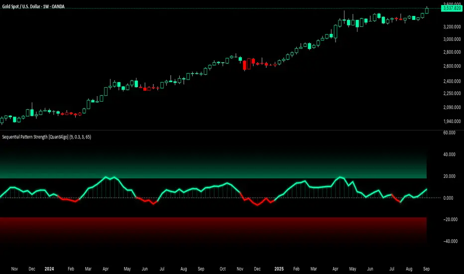 The Sequential Pattern Strength indicator measures the power and sustainability of consecutive price movements by tracking unbroken sequences of up or down closes. It incorporates sequence quality assessment, price extension analysis, and automatic exhaustion detection to help traders identify when strong trends are losing momentum and approaching potential reversal or continuation points.
